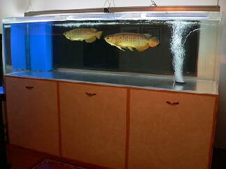 アロワナに夢中な私が、夢の水槽をゲットしました!!ヒデさんによって仕上げられた水槽は、正に芸術と言っても過言ではない位の出来栄えでした。オールクリアーで製作してもらい、壁を貫いて、両側から見えるようにした事で、明るい水槽となり大変満足致しております。ヒデさん本当に有り難う御座いました。